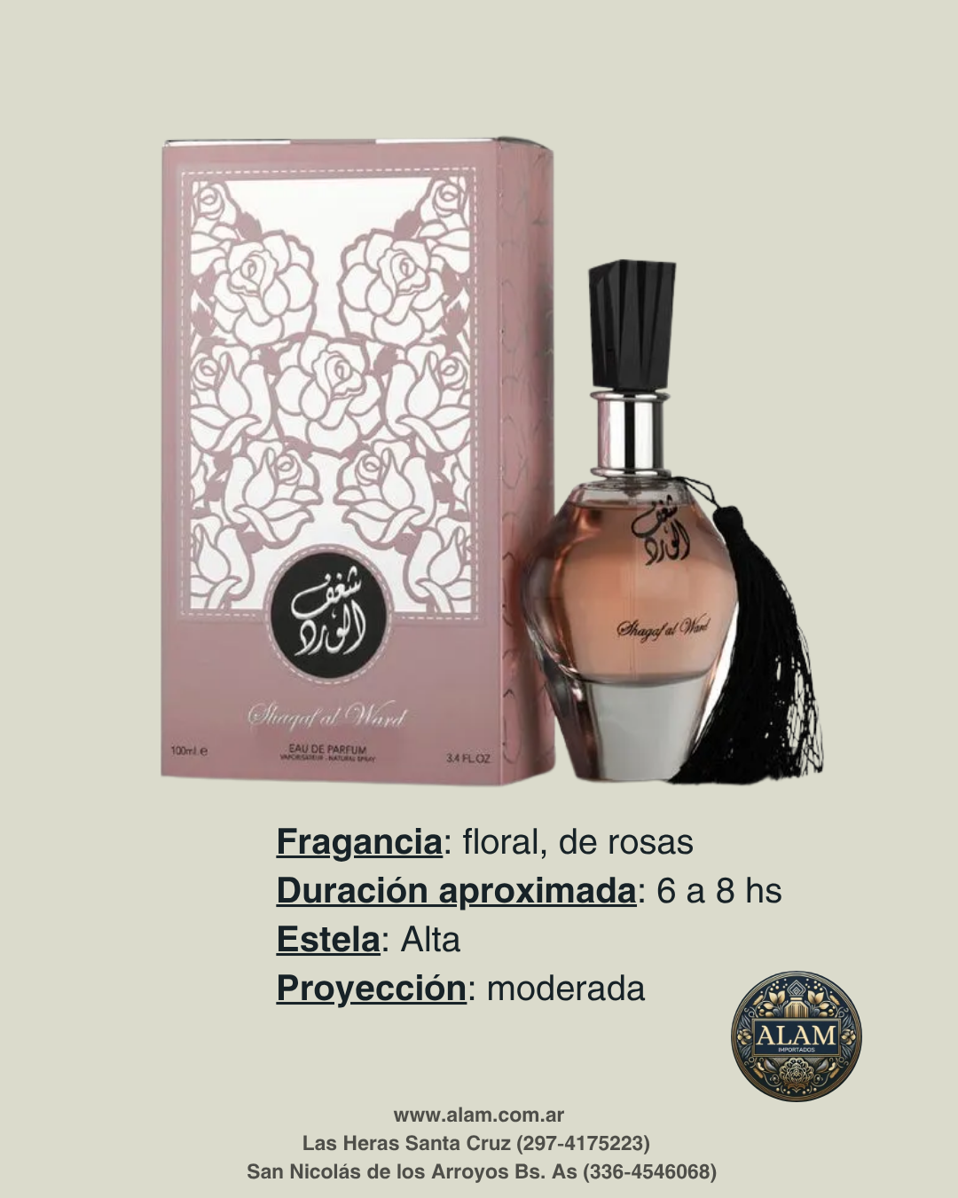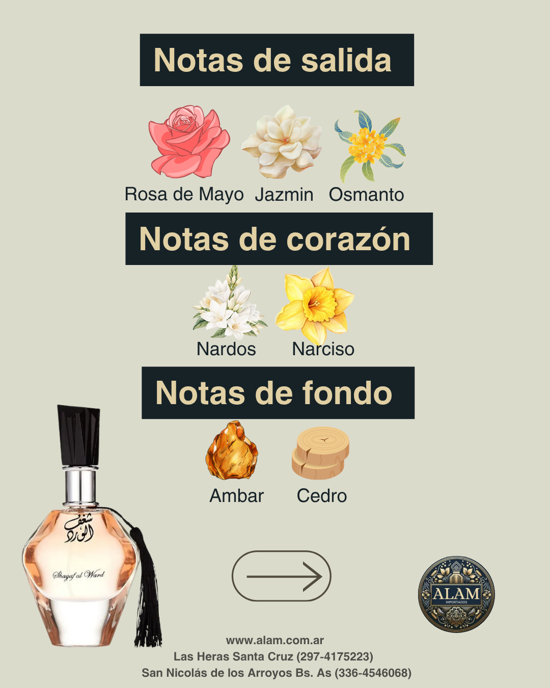 Shagaf Al Ward de Al Wataniah es una fragancia exquisita de la familia olfativa Oriental Floral, diseñada especialmente para mujeres que buscan un aroma sofisticado y femenino. Su apertura floral con notas de rosa de mayo, osmanto y jazmín envuelve los sentidos, mientras que el corazón de nardo de la India y narciso aporta profundidad y elegancia. El fondo cálido de ámbar y cedro completa esta creación única.