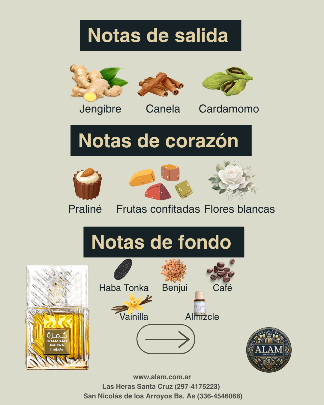 Khamrah Qahwa de Lattafa Perfumes es una fragancia Oriental Vainilla creada para hombres y mujeres que buscan un aroma envolvente y sofisticado. Su apertura especiada combina canela, cardamomo y jengibre, que dan paso a un corazón dulce y floral con praliné, frutas confitadas y flores blancas. En el fondo, la calidez de la vainilla, el café, el haba tonka, el benjuí y el almizcle crean un rastro irresistible.