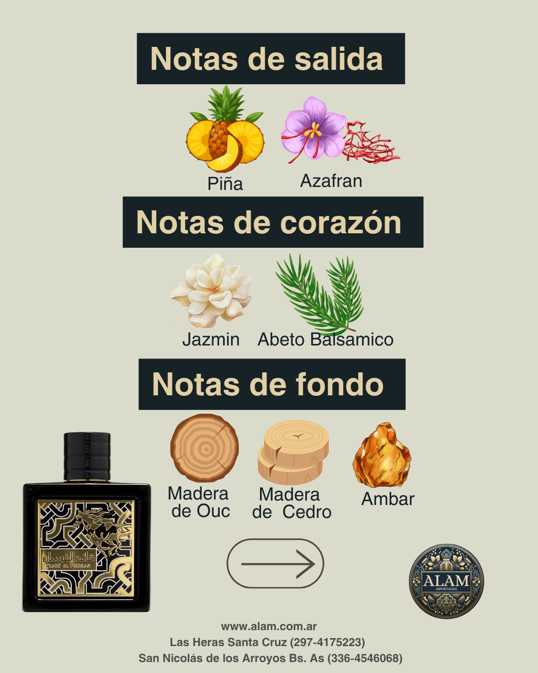 Qaed Al Fursan de Lattafa Perfumes es una fragancia sofisticada de la familia olfativa Oriental Amaderada, diseñada para hombres y mujeres.