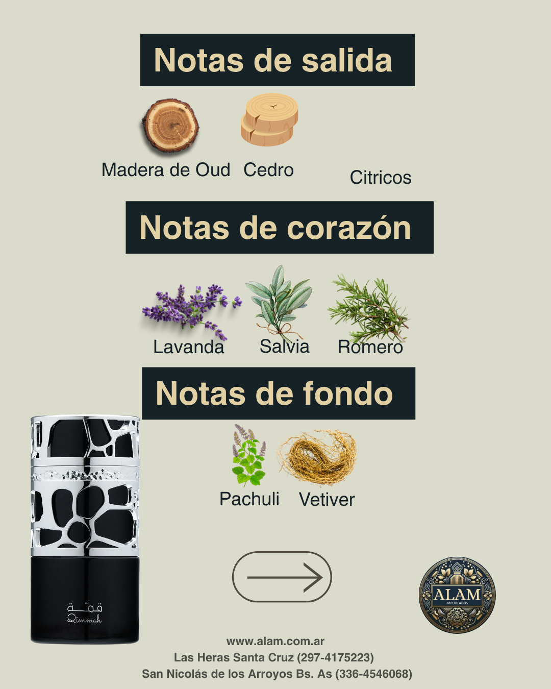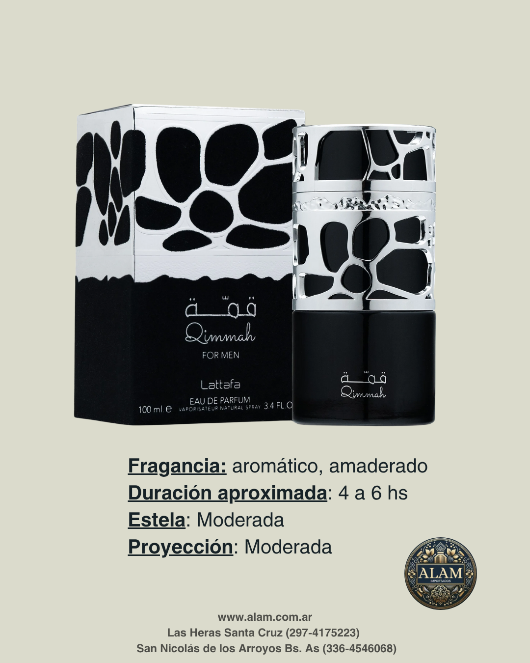 Qimmah for Men de Lattafa Perfumes es una fragancia sofisticada de la familia olfativa Amaderada Aromática, diseñada especialmente para hombres.