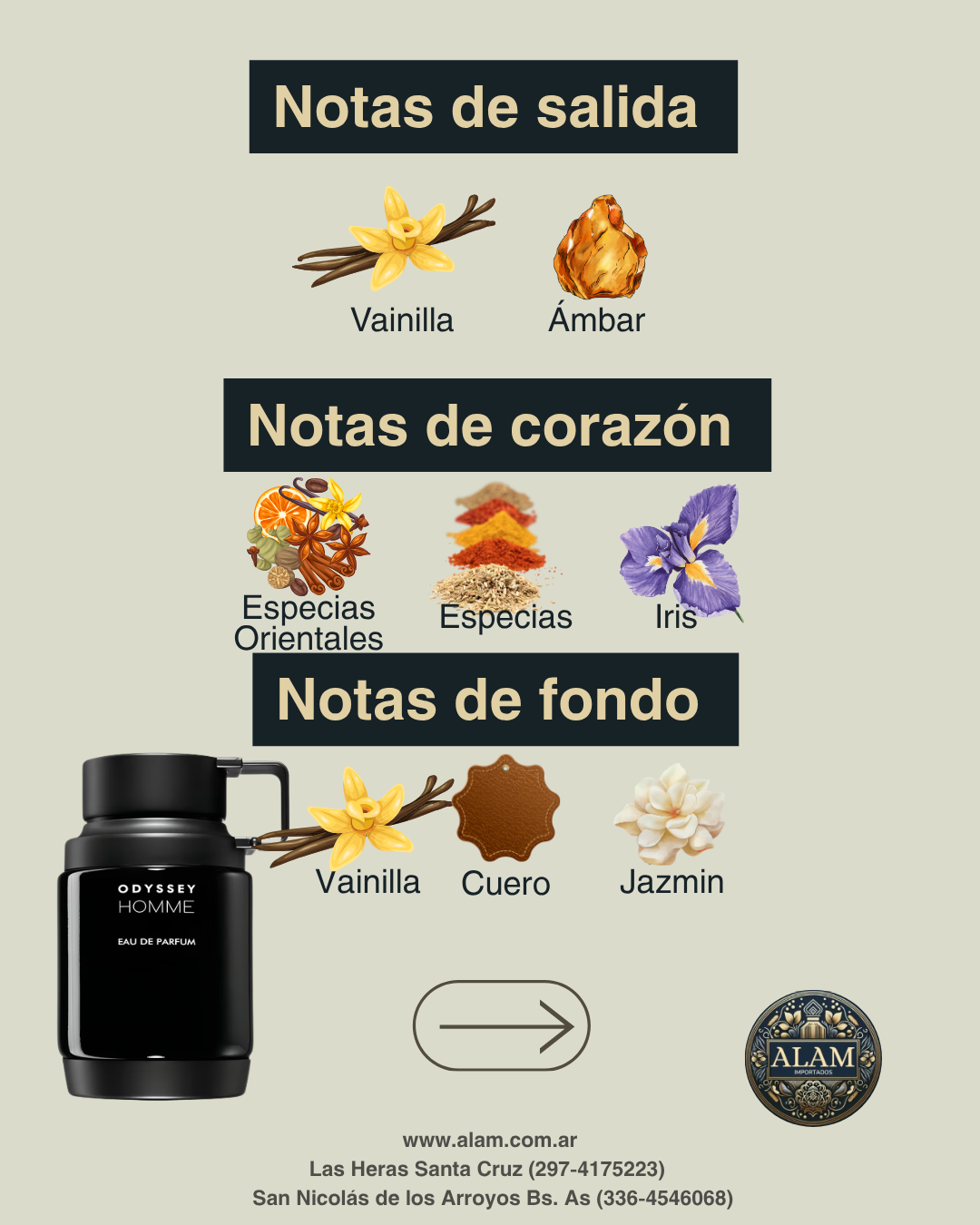 Abre con un dúo envolvente de vainilla y ámbar, seguido por un corazón con acordes orientales, especias y un toque sofisticado de iris. El fondo mezcla vainilla, cuero y jazmÃn, aportando profundidad y sensualidad.