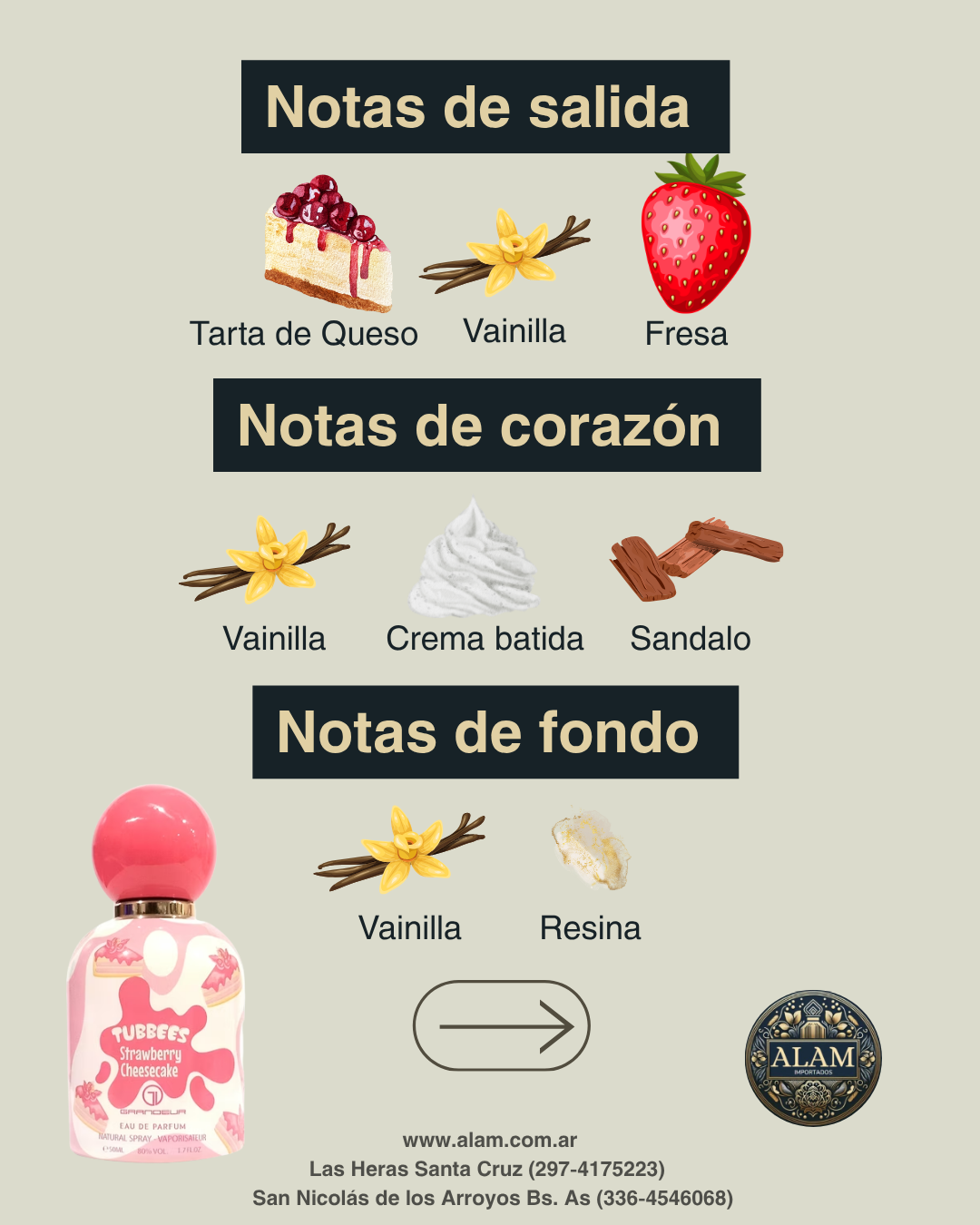 Con notas cremosas y frutales desde la salida, un corazón suave y envolvente, y un fondo dulce y avainillado, esta fragancia gourmand es ideal para quienes disfrutan de aromas dulces y originales.