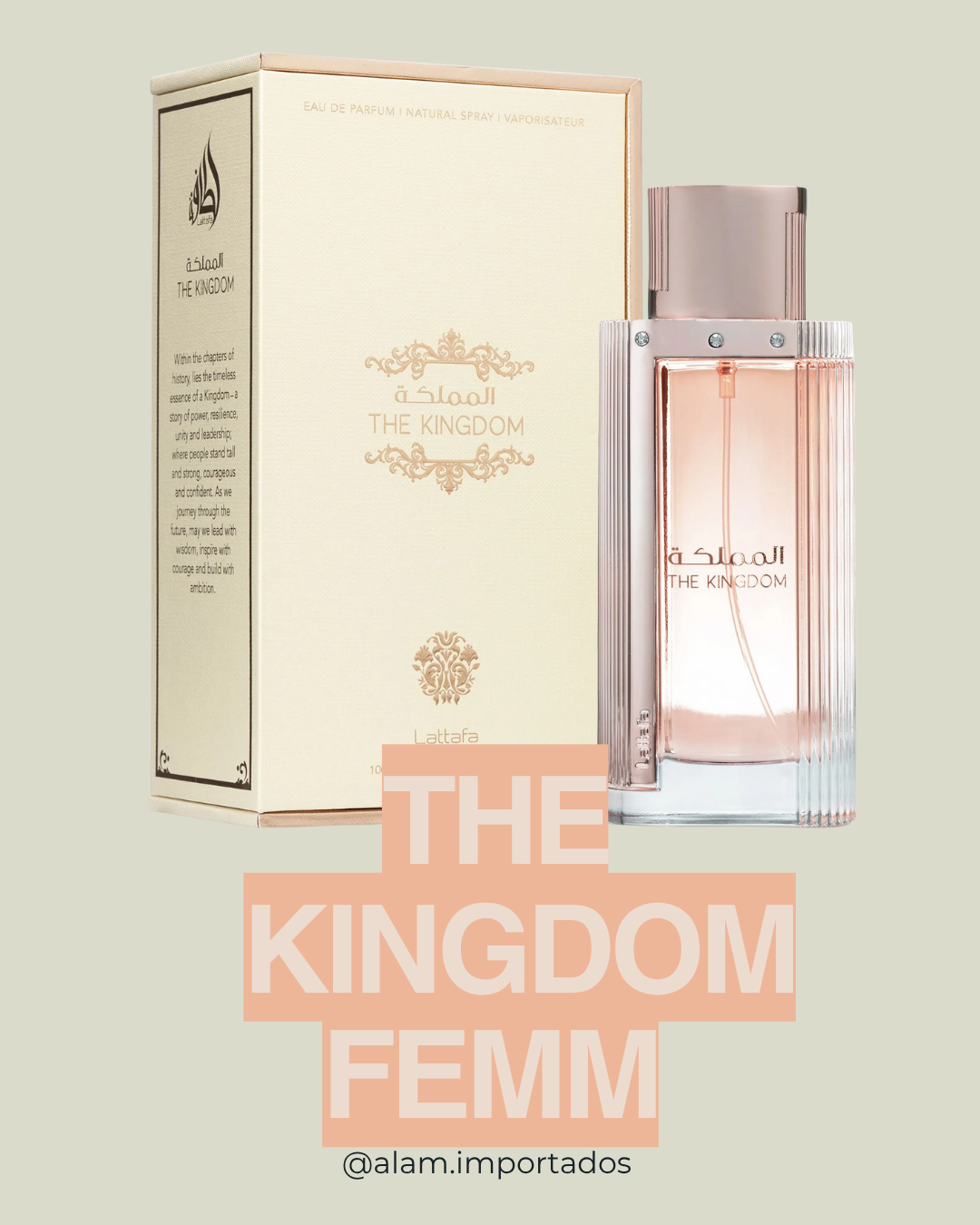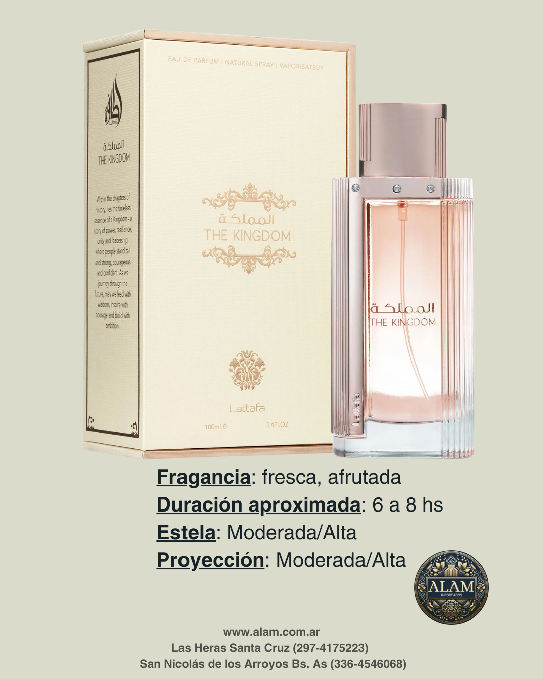 Lattafa The Kingdom es un Eau de Parfum femenino de 100 ml que combina elegancia, frescura y dulzura en una fragancia cautivadora.