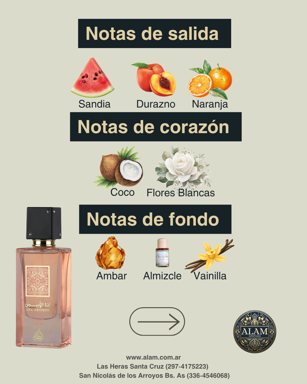 Se abre con una explosión frutal de sandÃa, durazno y naranja. En el corazón, el coco y las flores blancas aportan una sensación tropical y cremosa. El fondo de vainilla, almizcle y ámbar completa la fragancia con calidez y suavidad.