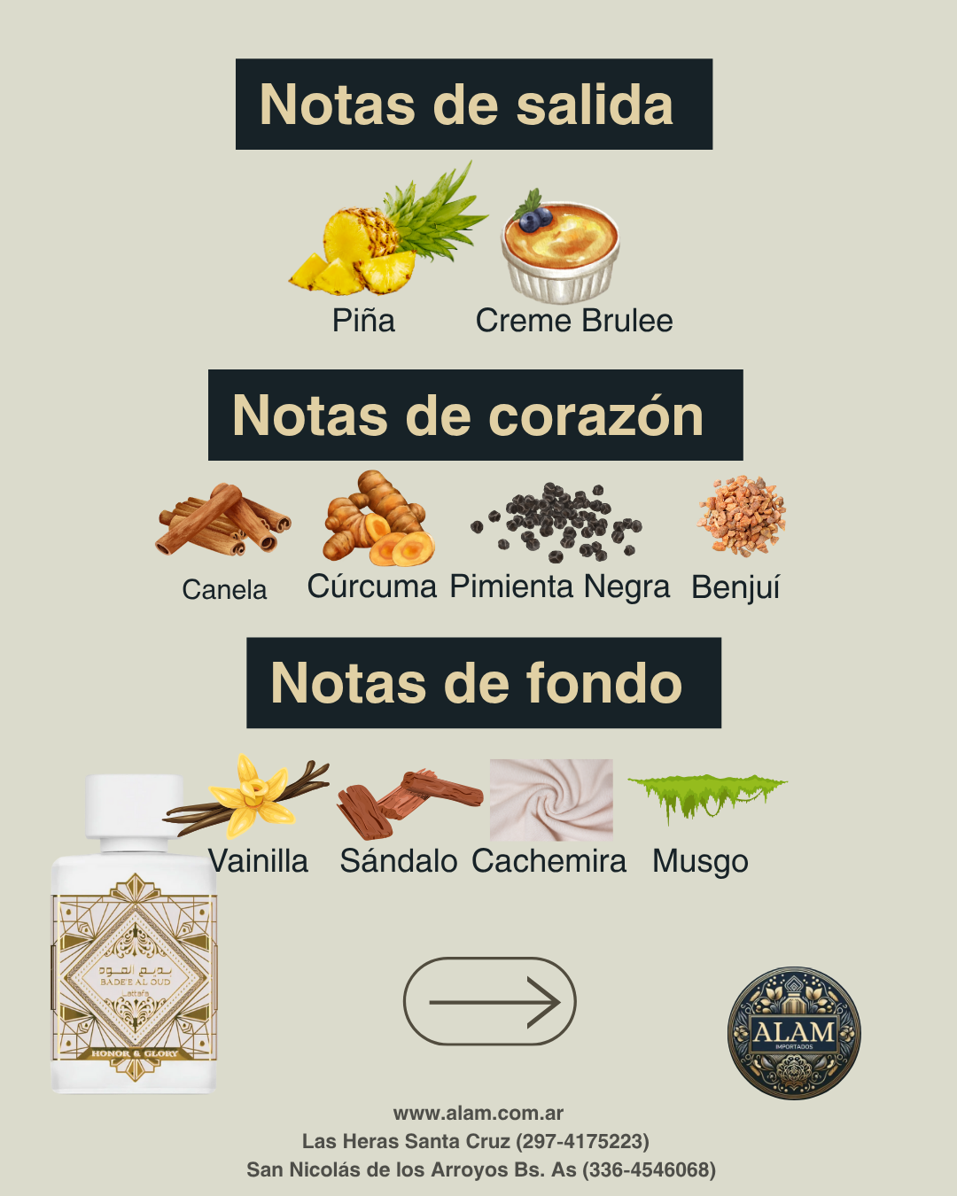 Con un inicio único de piña y créme brulée, un corazón especiado de canela, cúrcuma, benjuí y pimienta negra, y un fondo envolvente de vainilla, sándalo, cachemira y musgo, Bade'e Al Oud Honor & Glory es una experiencia aromática inolvidable. ¿Listo para honrar tu esencia? 🌠