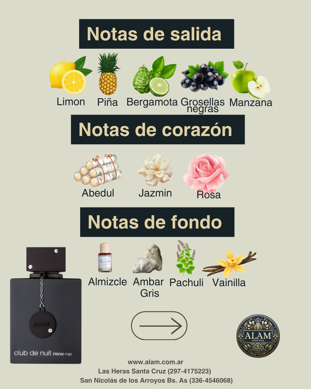Club de Nuit Intense Man arranca con notas frescas de limón, piña, bergamota, grosellas negras y manzana, dándole un toque cítrico y frutal. En el corazón, el abedul, jazmín y rosa aportan una elegancia profunda, mientras que el fondo de almizcle, ámbar gris, pachulí y vainilla deja una estela masculina, intensa y duradera.