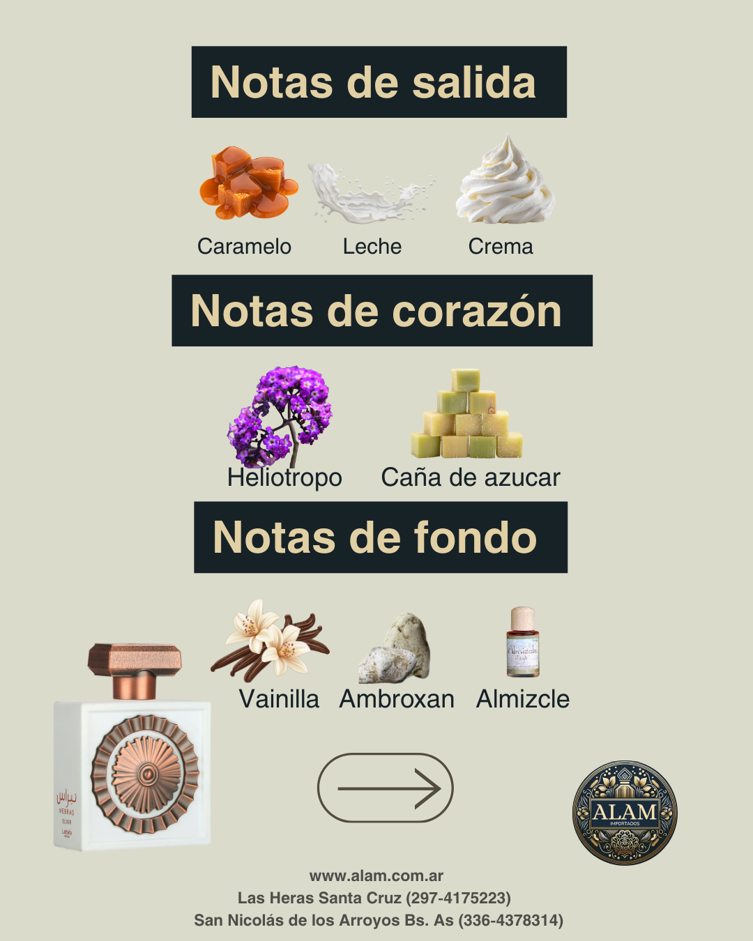Su apertura es intensamente gourmand, con caramelo de leche y crema batida que aportan una dulzura cremosa y reconfortante. En el corazón aparecen notas de caña de azúcar y heliotropo, que añaden un toque floral suave. El fondo de vainilla, ambroxan y almizcle deja una estela cálida, seductora y duradera.