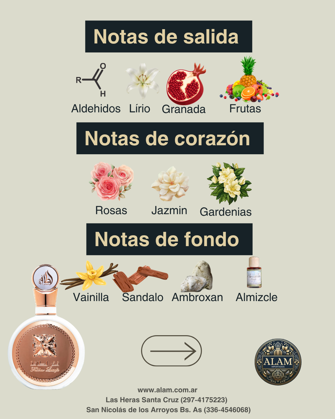 Fakhar Rose se abre con una mezcla fresca y afrutada de granada, azucena, frutas y aldehídos, seguida de un corazón floral intenso con nardos, jazmín, gardenia, ylang-ylang, madreselva, rosa y peonía. Su base cálida y sofisticada combina vainilla, almizcle blanco, ambroxan y sándalo, dejando una estela inolvidable. 🌺🌸