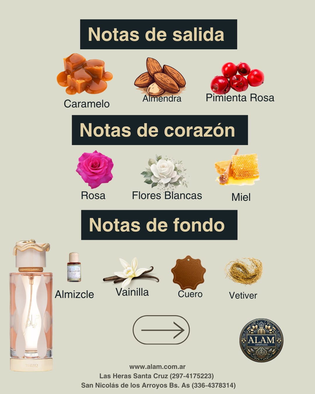 Teriaq comienza con una mezcla irresistible de caramelo, almendra amarga, chabacano y un toque especiado de pimienta rosa, seguido de un corazón dulce y floral con miel, ruibarbo, flores blancas y rosa. Su fondo profundo y seductor combina cuero, vainilla, almizcle, vetiver y ládano, creando una fragancia inolvidable. 🌹🖤