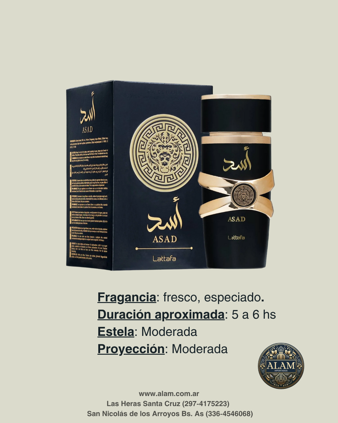 Asad es una fragancia intensa y magnética, diseñada para hombres que buscan un aroma poderoso y sofisticado. Perteneciente a la familia olfativa Oriental, combina especias, maderas y notas dulces para un carácter fuerte y elegante.