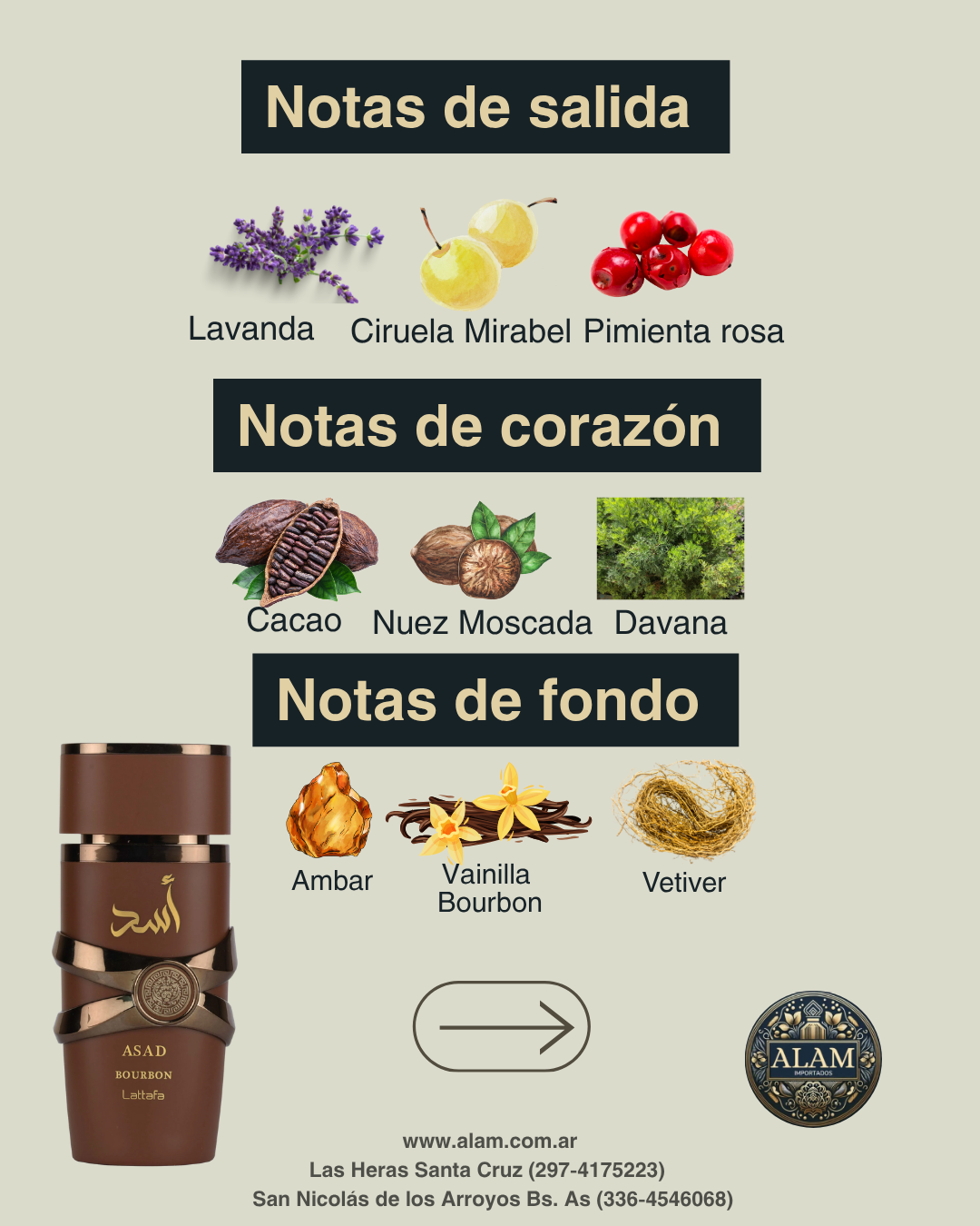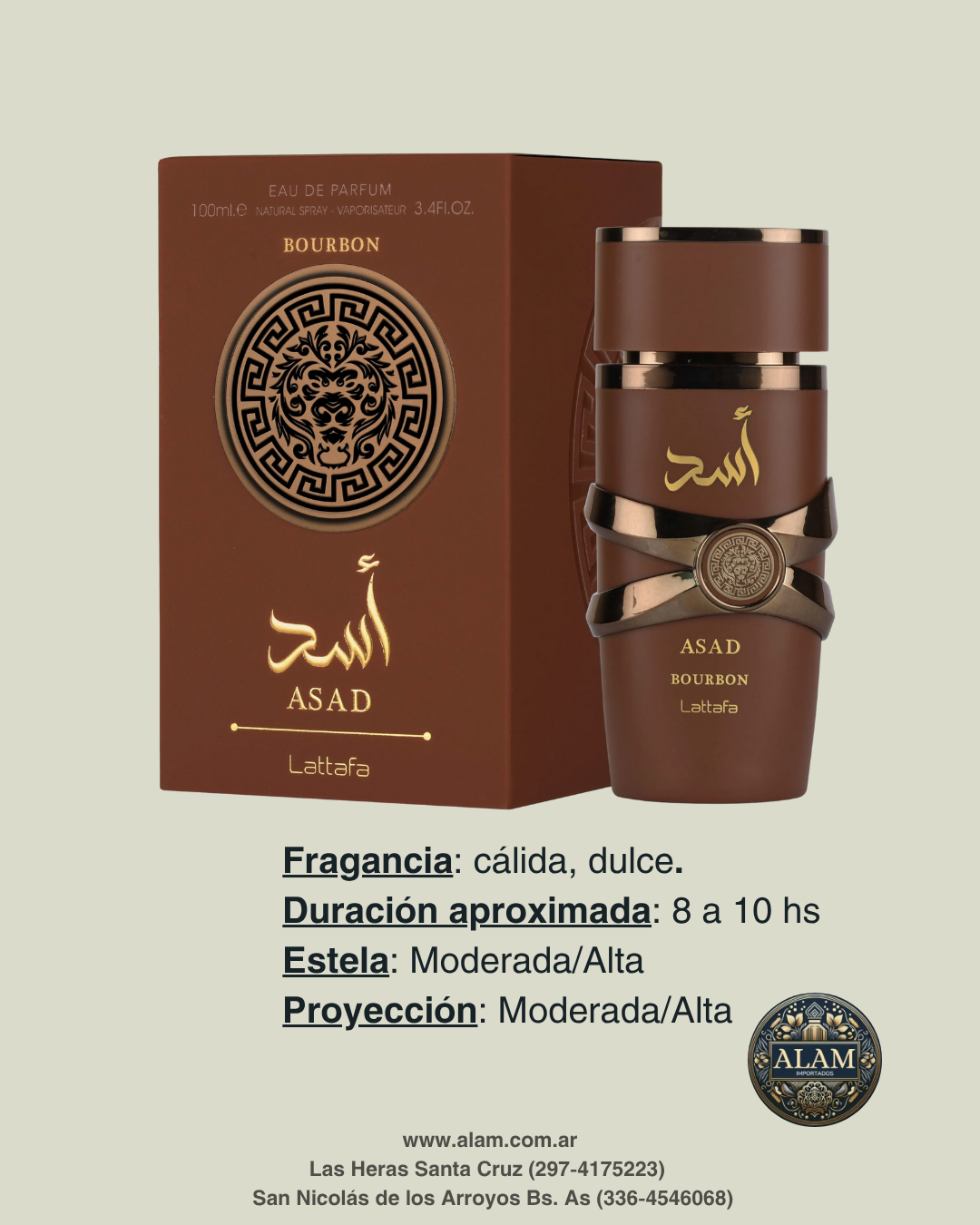 Asad Bourbon es una fragancia intensa y sofisticada que combina especias, dulzura y profundidad, ideal para el hombre moderno que busca imponerse con un aroma elegante y envolvente.