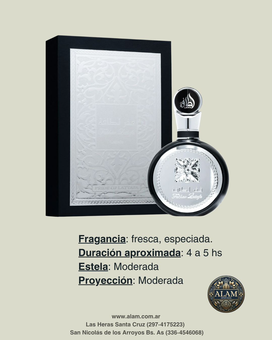 Fakhar Black abre con una mezcla vibrante de manzana, bergamota y jengibre que cautiva desde el primer momento. En su corazón, las notas de lavanda, salvia, bayas de enebro y geranio aportan un toque fresco y aromático, mientras que el fondo de haba tonka, Amberwood, cedro y vetiver deja una estela cálida, amaderada y sofisticada.