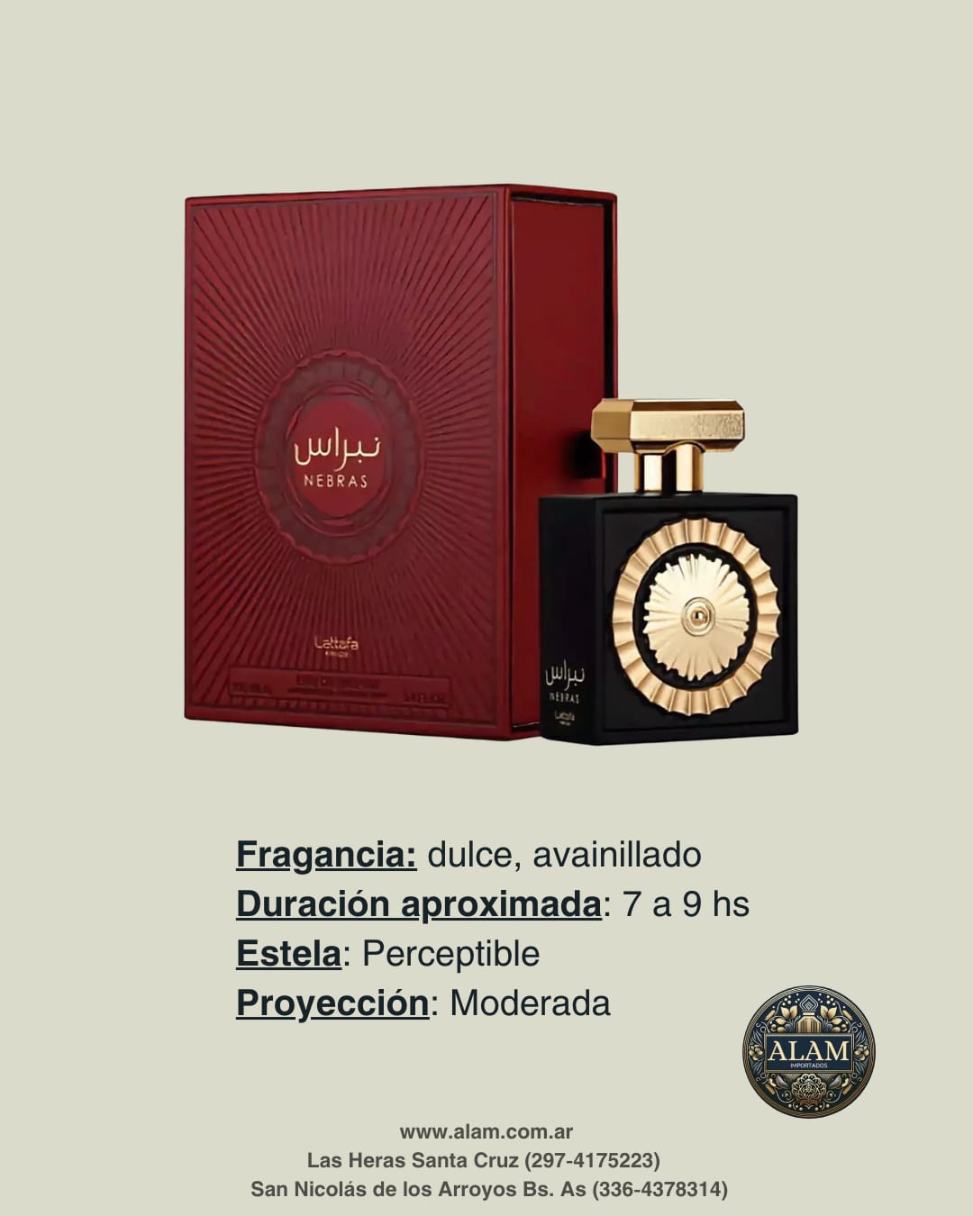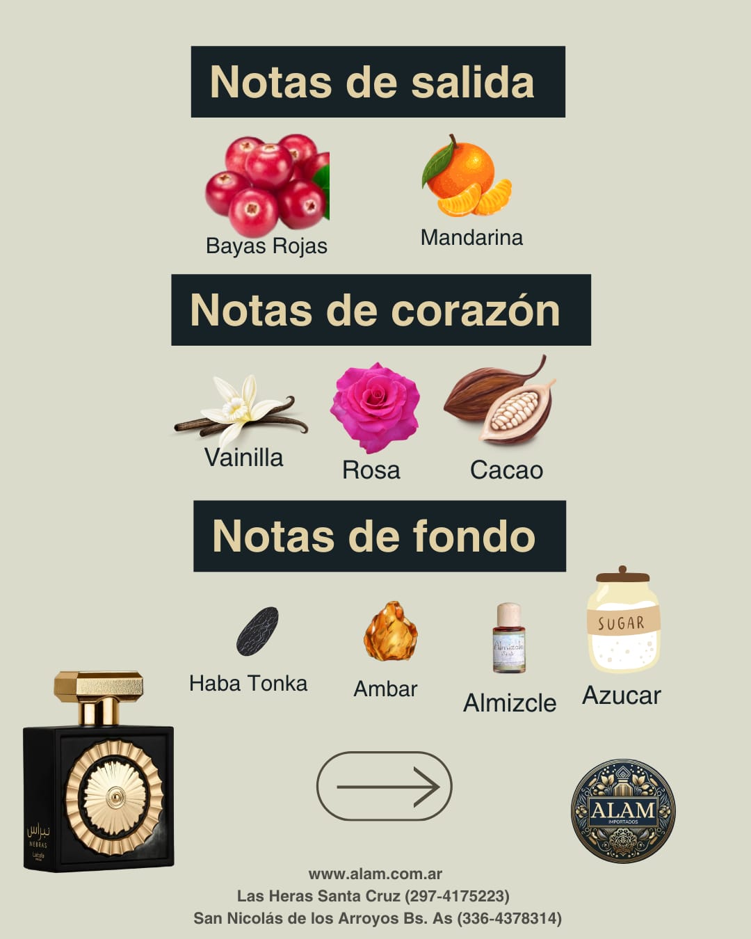 Nebras se abre con una mezcla fresca de bayas rojas y mandarina, creando una introducción vibrante y afrutada. En su corazón, las notas dulces de vainilla, cacao y rosa le aportan un toque suave y romántico, mientras que el fondo de azúcar, haba tonka, ámbar y almizcle deja una estela cálida y duradera.